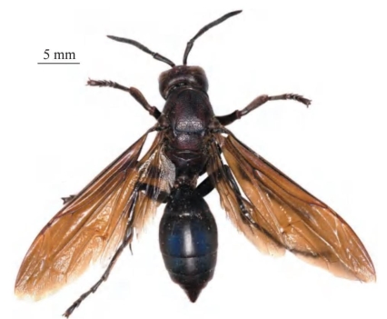 【形态特征】 体整体为红棕色至褐色、无黄色斑,其中头部及胸部背板常偏红棕色,胸部腹板及腹部颜色更深,体色与褐马蜂Po listes(Gyrostoma) tenebricosus近似。该种唇基宽大于长,端部中央呈角状凸出,密生刻点,边缘刻点较稀;雌性颚眼距长、等于1只触角窝内缘至另外1只触角窝外缘的间距。前胸背板、中胸盾片、小盾片、后胸背板具中等密度刻点(刻点小于刻点直径或等于刻点直径),其中中胸盾片中部刻点略稀疏,后胸侧板刻点较以上部位更稀疏;前胸脊发达;小盾片矩形,基部具弱的中纵脊;中胸侧板具侧纵脊、无背前侧片沟。雄性上颚和触角第13节变异、呈弧形;雄性腹部第7节腹板可见区域无枝突。
