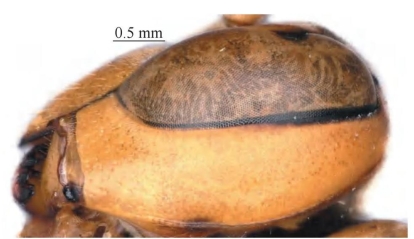 【形态特征】 体黑色,具大量黄色至黄棕色斑。该种色斑分布模式与陆马蜂Polistes (Gyrostoma)rothneyi非常相似,但黄斑常偏棕色且并胸腹节常无色斑;前胸背板呈黄色,前胸脊领状突起;中胸盾片呈黑色,具粗糙刻点,中部两侧具2条橙黄色纵条带,外侧邻近翅基片处常具1个短橙黄色纵斑;中胸侧板中部刻点粗糙、深。雌性后头脊不完整,未伸达上颚基部。雄性唇基与复眼不接触,触角最后1节略弯曲且呈圆柱形,腹部第7节腹板侧枝突不明显。