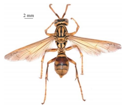 【形态特征】 体整体为黄色,具黑色斑和少量红棕色斑,雌性唇基至少额唇基沟为黑色。雄性唇基均匀隆起;雌性后头脊不完整。胸部稀生小刻点(前胸背板及中胸盾片刻点不明显);前胸脊发达;中胸侧板中部刻点稀疏、浅,具侧纵脊和背前侧片沟;后胸背板较宽;并胸腹节具深的中纵沟,两侧具发达横皱。雄性腹部第7节端部两侧的侧瘤突三角形,基部更宽,端部的枝突长,其端部竹片状。