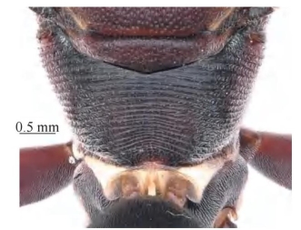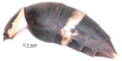 【形态特征】 头部和胸部绝大部分为红棕色,其中足跗节第1~4节、并胸腹节亚缘脊及腹瓣为象牙白色,并胸腹节及后足除跗节外为黑褐色,腹部为黑色,其中第1节背板端缘及腹板、第3节端部条带,以及第4节近中部条带均为象牙白色。前翅缘室端部明显具1个黑褐色斑;体具粗糙刻点;并胸腹节具发达的横皱,横皱完整覆盖背区、后区及侧区上侧。腹部第2节腹板向后逐渐隆起,侧面观腹缘略弧形;第3节端部条带较第4节的宽,第4节有时无条带。