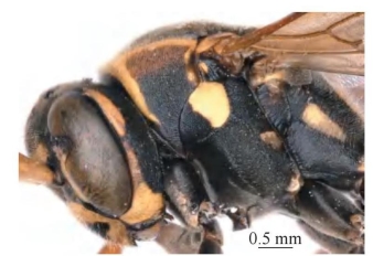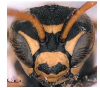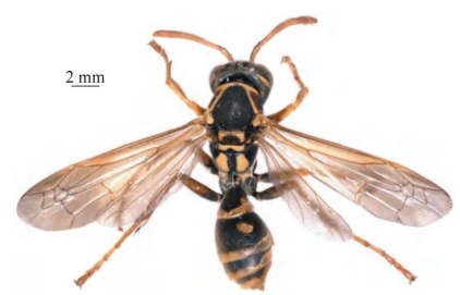 【形态特征】 体黑色,具大量黄色斑,色斑模式与跳马蜂Polistes (Polistes) associus类似;雌性唇基中部具1条黑色横带,其余为黄色。雌性唇基宽略等于长,疏生较大的刻点,大刻点之间密生细小刻点,端部中央呈角状凸起;雄性唇基扁平,四周略微隆起;雄性额区下半部分几乎全呈黄色。前胸背板内侧的黄色条带与前横带连接,其余呈黑色。腹节端部各具1条黄色条带,第2节背板中部具1对侧斑。