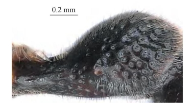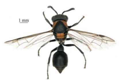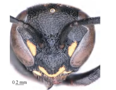 【形态特征】 体黑色,头部仅唇基端缘、额区下侧及上颚基部具少量黄色斑,胸部仅前胸背板、小盾片、后胸背板及并胸腹节后区下侧圆斑均为黄棕色,腹部为纯黑色;前翅色浅、透明,无褐色斑。唇基散生毛及刻点,刻点间光滑;后单眼至复眼间距小于或等于后单眼间距的2倍。整个胸部密生刻点与头部类似;并胸腹节基部两侧无垂直凸起的脊或纵沟;并胸腹节与腹柄基部连接处的突起中等大小,侧面观大部分孔口可见;前翅近端部具2个亚缘室,第2亚缘室基部角度大于90°。腹部第1节基部无明显腹柄,端部宽略大于长;第1、2节背板刻点类似,均密生刻点;第2节背板及腹板端缘无明显薄片。
