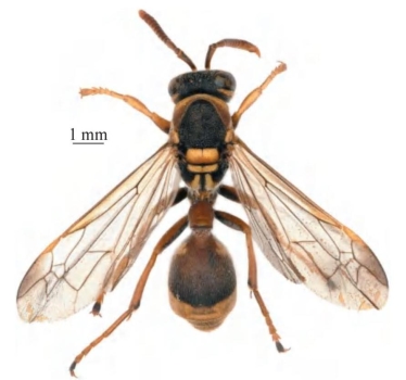 【形态特征】 体大面积红棕色且具黄色斑,唇基(除中部小黑斑外)、前胸背板基部、小盾片、后胸背板、并胸腹节沟两侧的斑、腹部第2节背板端部宽的条带及基部两侧的斑均为黄色;除单眼周围的头顶、中胸盾片为纯黑色外,其余主要为红棕色至褐色(部分标本没有纯黑色区域);前翅缘室具黑褐色斑。触角第3节明显较短,上颚端部具4枚齿,疏生刻点;唇基端部约1/2疏生刻点,其余光滑;后单眼至复眼间距小于后单眼间距的2倍;雌性触角第3节长小于端部宽的2.5倍;前翅第2亚缘室基部角度等于或稍大于90°;前胸脊近乎直线,肩角明显;并胸腹节具明显斜皱,基部两侧无垂直凸起的脊或纵沟,并胸腹节与腹柄基部连接处的突起较大,侧面观大部分孔口较模糊。腹部第1节背板长,明显柄状,背板基部至端部先窄后宽再变窄;第1、2节背板整体浅,不明显,其中第2节背板端部刻点更深且密。