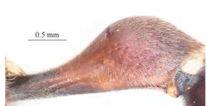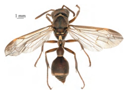 【形态特征】 体绝大部分为暗红棕色,具少量黑色及黄色斑,雌性唇基除端部外为红棕色或黑棕色,其端部具黄色斑,中胸盾片具红棕色斑;上颚基部、前胸背板前缘不明显的小斑、后胸背板两侧的斑、并胸腹节沟周围、腹部第2节背板端缘及基部侧板均为黄色;前翅缘室具褐色斑。雌性触角第3节长大于端部宽的3倍;颊区密生刻点,呈网状;后单眼至复眼间距大于后单眼间距的2倍。前胸脊前缘略微凹陷,肩角明显;并胸腹节背区密生细的斜皱,并胸腹节基部两侧无垂直凸起的脊或纵沟,并胸腹节与腹柄基部连接处的突起中等大小,侧面观大部分孔口可见;前翅第2亚缘室基部角度明显小于90°。腹部第1节基部具短柄,侧面观其长大于高的2.5倍;第2节背板与腹板部分愈合,背板端部不凸起;第1节背板疏生刻点,第2节背板刻点明显较密集。