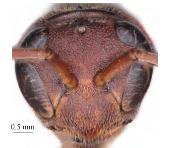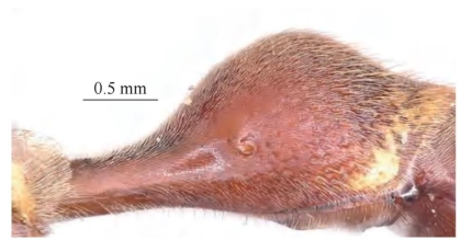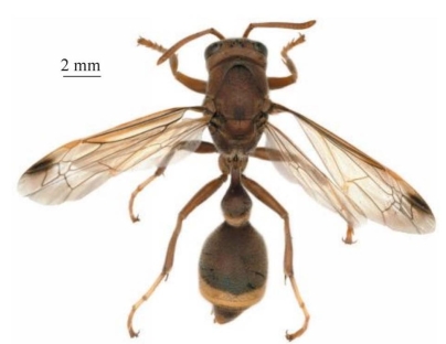 【形态特征】 体几乎全为红棕色,仅腹部第1、2节背板端部条带及足跗节为黄色,雄性唇基与额区下侧及触角间的斑连为整体且黄色,雄性后胸背板两侧具小黄色斑;前翅缘室端部具黑褐色斑。唇基除端部外密生毛而刻点不明显;头部比中胸盾片宽,该特征明显区别于我国该属其他种类。前胸脊前缘略微凹陷,肩角明显;并胸腹节中部两侧具凸起纵脊,并胸腹节与腹柄基部连接处的突起中等大小且较圆润;前翅近端部具3个亚缘室,第2亚缘室基部角度小于90°。腹部第1节基部明显柄状,长大于端部宽的1.5倍,第2节背板刻点较第1节略密、仅端缘具1排刻点。