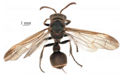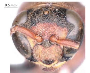 【形态特征】 体绝大部分为红棕色,头顶、前胸盾片、并胸腹节及足腿节常为黑色,上颚基部、唇基端部及腹部第1、2节端缘窄的条带均为黄色,其余几乎全为红棕色。唇基端部光滑,仅具零星刻点和毛;触角第3节长度明显大于第4、5节之和,长大于端部宽的3倍;唇基宽大于长。小盾片明显凸起,明显具中纵沟;前胸脊完整,基部略微弯曲;后胸背板端部光滑,无中沟;并胸腹节密生粗糙网状刻点,基部两侧无垂直凸起的脊或纵沟,并胸腹节与腹柄基部连接处的凸起较大,侧面观大部分孔口较模糊;前翅具3个亚缘室,第2亚缘室基部角度明显小于90°。腹部第2节腹板与背板几乎等长,但腹板端部的薄片略宽于背板的薄片,第2节背板背面观宽大于长,侧面观长与高相等;第2节腹板与背板未愈合。