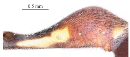 【形态特征】 体绝大部分为红棕色,明显具黄色斑和黑色斑;雌性唇基除中部黑色斑外均为黄色,雄性唇基与额区下侧、触角间的斑连成整体且为黄色,中胸盾片除端缘外大面积红棕色,颊区、前胸背板前缘、小盾片、后胸背板、并胸腹节中部,腹部第1、2节基部两侧的斑及第2节端缘条带等均为黄色;前翅缘室具褐色斑。唇基整体刻点稀疏、基部被毛未完全覆盖刻点,刻点间光滑;后单眼与复眼间距大于后单眼间距的2倍;雌性触角第3节长大于端部宽的3倍;颊区具细小刻点。中胸侧板腹侧光滑;并胸腹节背区密生细皱,基部两侧无垂直凸起的脊或纵沟,并胸腹节与腹柄基部连接处的突起较大,侧面观大部分孔口较模糊;前翅第2亚缘室基部角度明显小于90°。腹部第1节明显柄状,侧面观长大于高的2.5倍,第2节背板端部无凸起,腹部刻点整体不明显,似革质状。