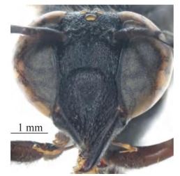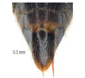 【形态特征】 体黑色,前胸背板前缘中部的窄条带及腹部第3节背板基部两侧的窄斑为淡黄色,腹部第1节背板中部至端部为红褐色。头部及胸部毛较浓密,胸部毛较长;唇基长大于宽,顶端具1枚尖齿,具中纵脊;雌性触角第3节细长,约为第4节长的2.8倍;雄性唇基毛较密;触角第3节细长,约为第4节长的2.5倍;触角窝之间及中胸盾片均具非常稀疏及浅的刻点。前胸背板侧区和中胸侧板背区具光泽、疏生刻点,刻点间光滑。腹部第2节背板基部略细,背板侧面观仅略隆起;腹部第3~6节腹板较粗糙,刻点较密;雄性第7节腹板基部具1对半圆形突起。