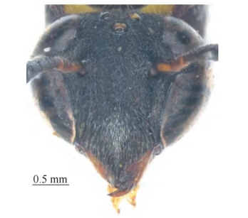 【形态特征】 雌性具黄褐色及白色短毛,胸部毛较长,腹部毛极短;体黑褐色,上颚、唇基亚端部中间小斑、触角柄节腹面、前胸背板背部后缘、中胸背板前端两侧纵斑及后端中间大斑、小盾片、后胸背板、并胸腹节下端、腹部第2节背板基部两侧、第3节背板基部及端部横带,第4、5节背板基部横带,第6节背板,足腿节外侧,胫节外侧;为黄色;足、触角腹面锈红色。雌性唇基端部粗壮,不分叉;触角第3节长约为第4节长的2.0倍。并胸腹节密生斜纵皱。