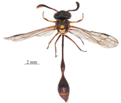 【形态特征】 体锈红色至黑褐色,具白色短毛;上颚基部、唇基亚端部中间小斑(或无)、触角柄节腹面、前胸背板背部两侧后缘、中胸背板前端两侧纵斑及后端中间大斑、小盾片1对小斑、后胸背板1对大斑、并胸腹节下端两侧大斑、腹部第2节腹板亚端部两侧纵斑、第3节背板和腹板基部两侧横斑(端部具浅锈红色横带)、第4节背板基部横带及第6节腹板两侧纵斑等均为黄色;雄性小盾片和后胸背板完全黄色。雌性唇基端部针状突、明显长,可见;触角第3节明显更长,为第4节长的3.0倍左右。前胸背板背区和并胸腹节具倾斜至纵向的皱;雌性腹柄为胸部长的2倍;雄性中、后足腿节基部的膨大相似,跗节第1、2节端部针状,第3、4节端部圆形。