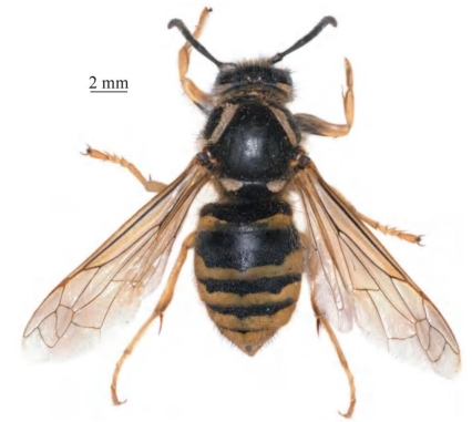 【形态特征】 胸部及腹部的斑及条带明显较宽(尤其腹部黄色带两侧向前延长),颊区具1条黄色长条带,唇基黄色或具1个棕或黑色小斑,有时黑斑延长但不到达唇基端部;复眼凹陷,经常仅下内侧为黄色;腹部各节黄色条带较其他种类宽,末节背板黄色。上颚第1枚齿的齿缘呈直线;唇基端缘中间微凹、两侧宽而略呈钝角,疏生刻点,边缘略密集;颚眼距短,额区头宽与颚眼距之比大于6;胸部疏生浅刻点,刻点间密生细微刻点,侧板刻点较背板密集;前胸背板下侧两侧无褶皱,前缘略凸出,两肩角圆形;中胸背板具前中纵脊和后端侧纵脊;小盾片矩形,具中纵沟;并胸腹节中央有浅沟;后胸侧板较窄。雄性腹部第7节腹板无切口。