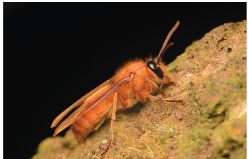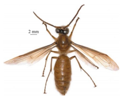 【形态特征】 体除头顶及单眼周围外几乎全为棕红色,无明显刻点,具棕色长毛。唇基隆起,端缘略浅凹陷,两侧宽弧形;额区(除两触角窝之间隆起处呈三角形淡棕色外)全呈暗褐色,具浅额中沟。前胸背板前缘窄,无前胸脊,两肩角圆形;后胸背板近似五边形,向下垂直,近基部中央具1条横凹陷;中胸侧板平,不隆起;后胸侧板窄,后缘与并胸腹节几乎愈合。腹部长,约为胸部的2倍,第1节背板略窄于第2节。