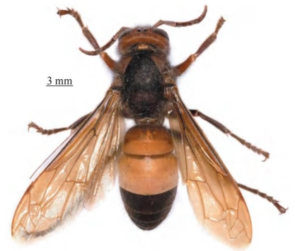 【形态特征】 体黑色,头部、前胸背板、中胸小盾片、腹部第1背板基部及第2节背板前缘常红棕色,第2节背板如果大部分为黑色则头顶也为黑色(分布于云南的部分种群头部为黑色),第1节背板端部及第2节背板除前缘外为橘黄色,翅除端部外为褐色。头顶未明显延长,头顶复眼间距等长或几乎等长于后单眼至后头脊的距离;单眼正常大小,后单眼间距小于后单眼与复眼间距。唇基宽略大于长,密生粗糙大刻点,端缘中间深凹而无中齿,两侧非齿突状、呈宽弧形状;额区和头后缘具长毛;颊区侧面观小于复眼中部宽的1.7倍。前胸脊凸出,两肩角圆形;中胸盾片刻点大且相连,刻点间距为小于或等于1个刻点直径;翅基片前脊完整。腹部第1节长等于或大于宽的1/2。