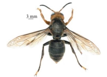 【形态特征】 该种与笛胡蜂Vespa dybowskii较近似。腹部整体为黑褐色至黑色(第1节基部偶有红褐色斑),末节为棕黄色,头部黄棕色,胸部(除前胸背板常红褐色外)主要为黑色,雄性中胸盾片基部偶具1对红褐色斑。唇基刻点不及笛胡蜂Vespa dybowskii的粗糙,整体偏小且中等密度,刻点间距等于或略大于刻点直径,端缘两侧呈宽的圆弧形;颊区侧面观小于复眼中部宽的1.7倍;头顶未明显延长,复眼间距等长或几乎等长于后单眼至后头脊的距离;单眼正常大小,后单眼间距小于后单眼与复眼间距。中胸盾片明显暗、无光泽,密生刻点,蜂王和雄性密生刻点和长毛;翅基片前脊完整。腹部第1节长小于宽的1/2。