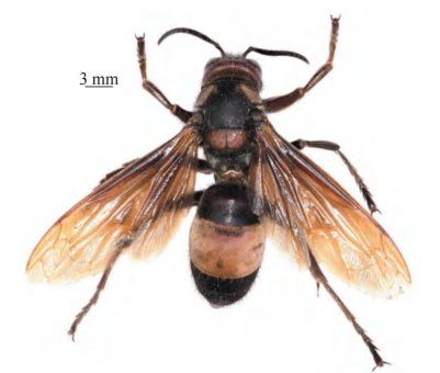 图6-354-3 金箍胡蜂Vespa tropica雌性(蜂王,红头型)背面观