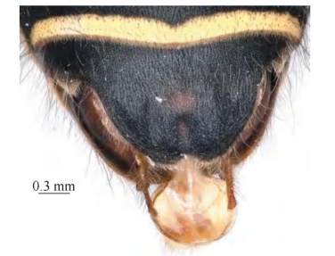 【形态特征】 体黑色,明显具黄色斑,背面观具黑和黄2种颜色,其中复眼凹陷的浅色区域中间无黑色隆起,边缘直、凸起或直接与额区浅色区域相连;腹部第1节至末节具完整的条带,工蜂腹部条带较蜂王及雄性的窄,蜂王腹部第2至末节的条带明显变宽(除第2节外,其余各节黄色区域大于黑色);上颚基部无三角形黑色斑,工蜂上颚外侧凸缘直、不明显弯曲;唇基中部具小黑斑,黑斑通常不到唇基端缘;后头脊在头顶退化、仅两侧明显,且未延长至上颚基部,通常小于头部侧面长的3/4。并胸腹节光滑,无褶皱;蜂王并胸腹节无粗糙的褶皱,表面光滑具刻点,仅在与腹部连接处具弱褶皱。腹部第1节背板基部无隆起,也无凹陷,具长的黄棕色毛,水平区均匀、两侧缘几乎平行,前截面中部非凹陷;蜂王腹部第6节腹板后侧向后钝圆形,在近端部突然变窄,几乎形成90°陡坡;雄性腹部第7节背板两侧在接近末端处突然垂直变窄,背面观呈四边形,端缘切口很浅或无切口;雄性外生殖器短,长与宽之比小于1,阳茎端部勺状区域两侧具1个小的半圆形突起及无尖齿钩,阳茎端部凹陷。