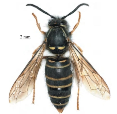 【形态特征】 体黑色,具少量黄色至棕黄色斑,其中唇基大部分为黑色,两侧具1对括号状的黄色条带,黄色条带明显窄于中部黑色区域,后胸背板和雄性基节无黄色斑,腹部第1~5节背板端缘分别具几乎等宽的黄色条带,第1节前截面及其上边缘1对窄斑为黄色。该种与那氏黄胡蜂Vespula nursei在结构上近似,主要相同点为:工蜂唇基端缘中部两侧齿状突出,除绒毛外疏生黑色长毛,雄性唇基端部几乎无突起。中胸盾片大刻点间距通常大于刻点直径,两个大刻点间通常具2个及以上更小的刻点,小刻点深、表面暗;后足胫节无长斜毛。腹部第1节背板具长的黑色毛,水平区向前略收拢,前截面中部略凹陷;雌性腹部末节腹板侧缘向端部逐渐变窄,坡度平缓;雄性末节背板两侧向末端逐渐变窄。主要区别为其颚眼距较那氏黄胡蜂Vespula nursei的更长,为头宽的1/17~1/14;唇基刻点更密且粗糙,刻点间距等于刻点直径;后头脊更短,约占头侧面长的1/2;唇基宽大于长,端缘中部凹陷略深,以及绝大部分为黑色。
