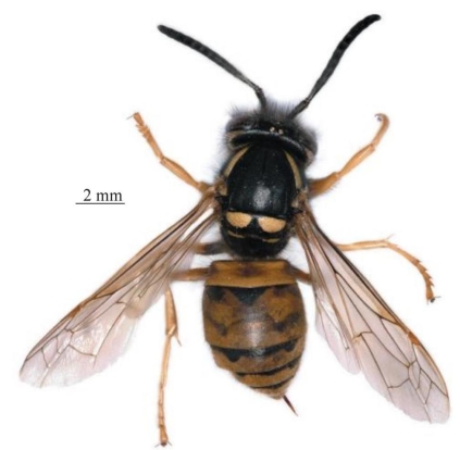 【形态特征】 与金氏黄胡蜂Vespula kingdonwardi近似。主要区别为:工蜂颚眼距短,为头宽的1/25~1/20;后头脊长,约占头侧面长的7/10。雌性唇基绝大部分甚至全为黄色,后胸背板具1对黄色斑;雄性基节具1个黄色斑。唇基端缘中部略凹陷,几乎平截,两侧非齿状突、宽弧形,疏生刻点,除短浅棕色柔毛外还疏生更长的毛,毛明显短于近似种的黑长毛。