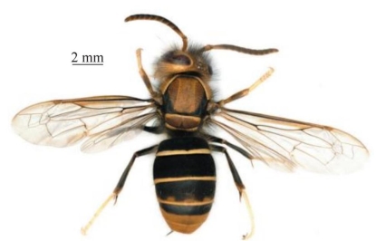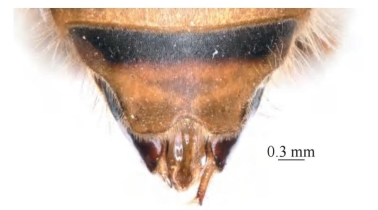 【形态特征】 背面观体具黑、黄和棕3种颜色,头顶棕色尤其明显,中胸盾片常具1个棕红色大斑块(腹部几乎无黑色时,盾片为纯黑色),前胸背板和中胸小盾片棕色有时较少,腹部第1、2节背板条带常黄色且窄于其余各节,第3节至末节条带更宽且为黄棕色,最后3或4节可见部分几乎全为黄棕色(有时腹部除第1、2节黄色条带外,其余几乎全为棕红色)。雌性额区触角间无凸起或退化状,唇基端缘略凹陷,两侧角不明显,宽弧形;后头脊延长至上颚基部。中胸盾片刻点略稀疏,刻点间距通常大于刻点直径;后胸侧板腹面无粗壮的褶皱;并胸腹节密生刻点,刻点间具褶皱,工蜂的褶皱不明显。腹部第1节背板前垂直面凹陷明显,雌性腹部末节腹板侧在近端部突然变窄,几乎形成90°陡坡;雄性末节背板两侧在接近末端处近似截状,背面观呈四边形;生殖器背端突呈刺状,阳基侧突端刺末端不明显变窄、呈指状。