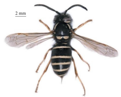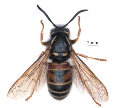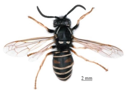 【形态特征】 体黑色,具淡黄色斑;雌性唇基除中部具匕首状黑色斑外全为黄色,复眼凹陷的黄色带窄细,仅在下缘具短条带;部分种群腹部第1、2节背板具红色斑或两侧大部分为红色。中胸小盾片和腹部具更细小且浅的刻点,刻点间更具光泽;后足胫节无长斜毛;唇基略隆起,端部中央略凹陷,具稀疏刻点,刻点的直径小于刻点之间的距离;额区、头顶和颊区密生浅刻点,刻点直径大于刻点间距。工蜂唇基端部钝、凸出,雄性端部几乎无凸出;中胸盾片大刻点间距通常约等于或小于刻点直径(除中部刻点间距大外),大刻点间通常具更小刻点,小刻点浅且表面几乎光滑。腹部第1节背板水平区向前略收拢,前截面中部略凹陷;雌性腹部末节腹板侧缘向端部逐渐变窄,坡度平缓,雄性末节背板两侧向末端逐渐变窄。