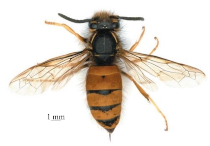 【形态特征】 体黑色,具大量黄棕色及黄色斑,其中腹部各节除基部外绝大部分为黄棕色,前胸背板、腹部第2节背板和腹部第2~4节腹板的棕色尤其明显(蜂王腹部条带常为黄色且较窄,黑色区域大于浅色,中胸盾片纯黑色或几乎全为红棕色);腹部背板具短的棕色毛以致显色部分呈棕黄色;唇基黄色至橘黄色,中间无黑色斑;小盾片和后胸背板黑色。后头脊延长至上颚基部;雌性上颚第3枚齿后的内缘直或最多略凹陷;颚眼距长,头宽与颚眼距之比小于18;并胸腹节无粗糙的褶皱,表面光滑无刻点,仅在与腹部连接处具弱褶皱;腹部第1节背板具长的黄棕色毛,水平区均匀、两侧缘几乎平行,背板基部无隆起、也无凹陷,前截面中部非凹陷;雌性腹部末节腹板两侧在近端部突然变窄,几乎形成90°陡坡,后侧向后钝圆形,雄性末节背板两侧在接近末端处突然垂直变窄,背面观呈四边形,端部切口很浅或无切口;阳茎端部勺状区域两侧具1个小的向后尖齿钩;阳茎端部圆、无凹陷,阳茎基腹铗腹面观不可见。
