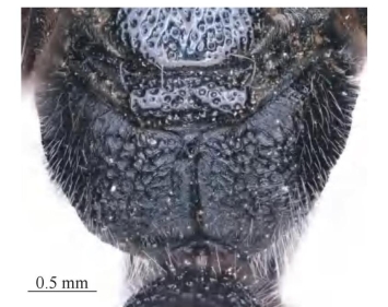 【形态特征】 除前胸背板外,体几乎全为黑色。唇基宽稍大于长,端部平截,端部宽稍大于唇基宽的1/4,刻点深不规则,基部稍凹陷。胸部长约为宽的1.5倍,前胸脊完整,前胸背板刻点似头部,侧下角具不明显脊,胸部至前胸背板具色斑。腹部第4节背板端部两侧具明显薄片。