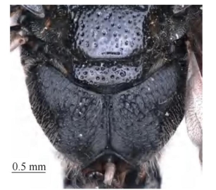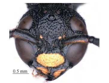 【形态特征】 体黑色,其中唇基、上颚及腹部具黄色斑。唇基基部具1条较短的纵脊,唇基宽明显大于长,边缘近平截,端部宽约为唇基宽的1/3,具不规则大刻点,网状,基部边缘轻微凹陷;并胸腹节背侧区交界处具侧脊。腹部第1节背板侧面观在近基部向中部剧烈隆升,第2~4节背板端部具完整的发达翘起的薄片。