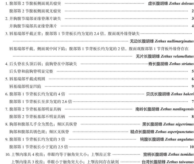 【地理分布】 本属分4亚属,其中Madecazethus亚属仅包括2种,分布于马达加斯加岛;Zethoides和Zethusculus亚属分布于美洲,包括68种;长腹胡蜂亚属Zethus包括202种,除澳洲区外为世界性分布,该亚属东洋区分布26种,古北区分布2种。
