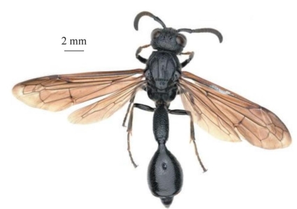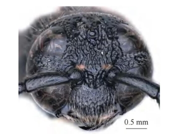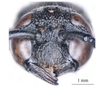 【形态特征】 体几乎全为黑色,仅触角窝上方具1个小黄色斑,翅黑褐色。唇基端部明显凹陷;胸部宽度和头部宽度相当,具不规则刻点;背面观长约为宽的1.3倍,具短毛及刻点。前胸背板前缘明显截状,两侧面下角具不规则的横皱,前胸脊完整;并胸腹节无光泽,背区无刻点,后区革质,粗糙,亚中脊极弱,并胸腹节背区与侧区相接处存在明显脊,侧区上部具大刻点,下半部光滑。腹部第1节背板长约为宽的3倍。