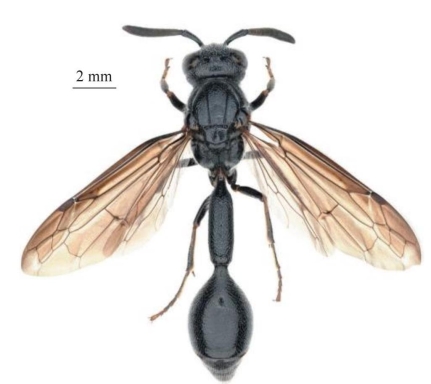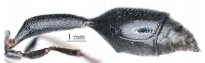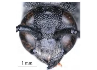【形态特征】 体几乎全为黑色,仅雄性唇基中部及上颚内侧为浅黄色,触角窝上方的小斑为黄色。唇基宽大于长,端部近平截,端部宽约为唇基宽的2/5,两侧可见不甚明显的小齿;唇基基部稍凹陷。前胸脊完整;前胸背板刻点近似网状,侧区腹侧明显具脊;中胸盾片具完整盾纵沟,中胸盾片和小盾片刻点较前胸背板稀疏而浅,且向基部更稀疏、更浅,刻点间具微小刻点或光滑。腹部第1节明显长柄状,长约为宽的3.3倍,两外侧缘亚平行,端部收缩不明显;第2节腹板侧面观具瘤突;第2节背板密生刻点,略呈网状,端缘薄片明显反翘;第3节背板疏生刻点,刻点间光滑,端缘薄片更厚且不反翘。