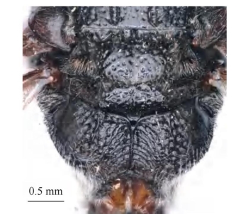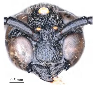 【形态特征】 体黑色,仅触角窝上方的小斑为黄色。唇基宽约为长的1.3倍,端部深凹,端部宽约为唇基总宽的1/4,端缘两侧呈齿状;唇基基部平,具网状刻点。上颚4枚齿,齿正常;单眼约等于触角突大小;后头脊和前胸脊明显完整。前胸背板背面观刻点近似网状,侧区后端明显具脊;中胸盾片基部刻点与前胸背板相似,略疏且浅,中部至端部刻点明显稀疏,刻点间光滑,两侧明显具纵脊;并胸腹节背区两侧皮革状,无刻点,端部具亚缘脊薄片。腹部第1节背板长小于宽的2.5倍;第2节背板疏生刻点,刻点间光滑,腹板侧面观无瘤突;第2、3节背板端缘明显具薄片,薄片略反翘。