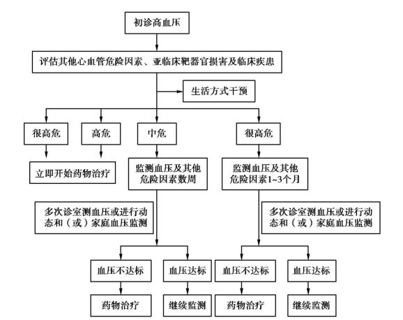 降压药物治疗的时机取决于心血管风险评估水平。在改善生活方式的基础上,血压仍超过140/90mmHg和(或)目标水平的患者,应给予药物治疗。高危和很高危的患者,应及时启动降压药物治疗,并对并存的危险因素和合并的临床疾病进行综合治疗;对于中危患者,可观察数周,评估靶器官损害情况,改善生活方式,如血压仍不达标,则应开始药物治疗;对于低危患者,则可对患者进行1~3个月的观察,密切随诊,尽可能进行诊室外血压监测,评估靶器官损害情况,改善生活方式,如血压仍不达标可开始降压药物治疗。对初诊高血压患者而言,尤其应遵循这一策略,其评估及监测程序见图3.1。
