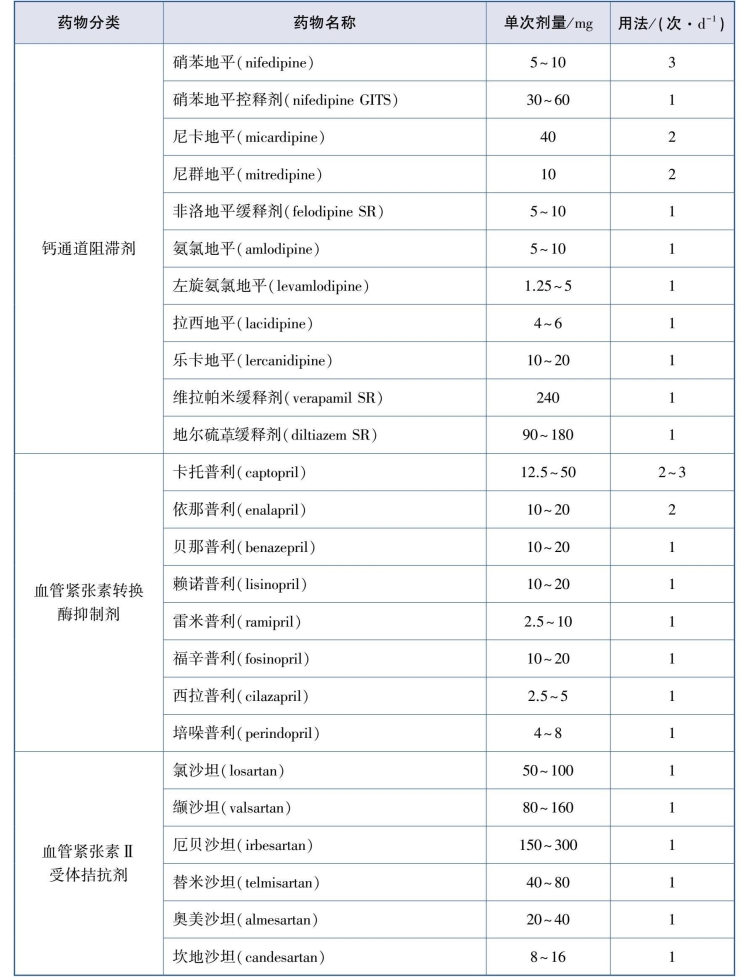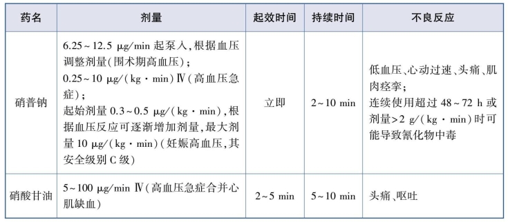 ③控制性降压:在不影响脏器灌注的基础上降压,渐进将血压调控至适宜水平。初始阶段(1h内)血压控制的目标为平均动脉压的降低幅度不超过治疗前水平的25%。在随后的2~6h将血压降至较安全水平,一般为160/100mmHg左右。如果可耐受,在以后24~48h逐步降压达到正常水平。对于妊娠合并高血压急症的患者,应尽快、平稳地将血压控制到相对安全的范围(<150/100mmHg),并避免血压骤降而影响胎盘血液循环。不同靶器官受损的高血压急症降压的幅度及速度不同。如为合并急性冠脉综合征、急性左心衰,需要尽快将血压降至可以改善心脏供血、降低心肌氧耗量、改善心功能的水平。如为合并主动脉夹层,应该迅速降压至维持组织脏器基本灌注的最低血压水平,一般需要联合使用降压药,并要重视足量β受体阻滞剂的使用。如不适用(如气道阻力增加),可考虑改用非二氢吡啶类CCB。