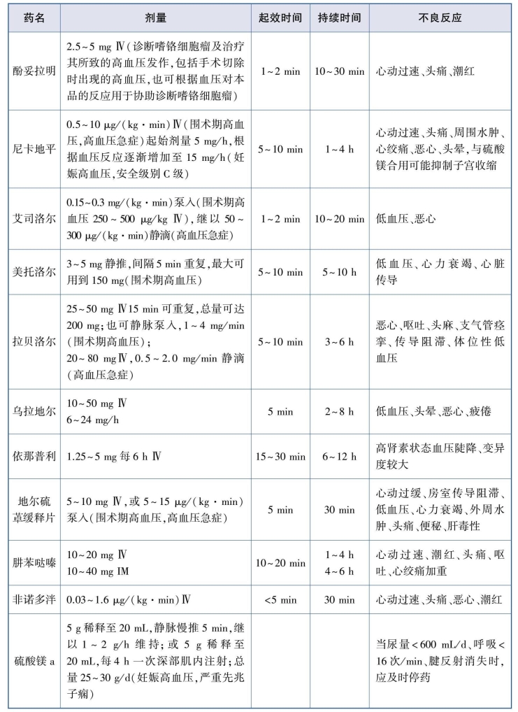 注:Ⅳ—静脉注射;IM—肌内注射;a—非高血压药物;急症降压药使用详见各种药物的说明书。