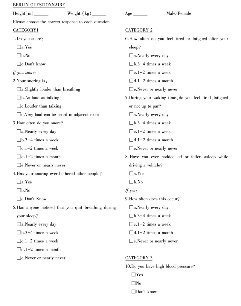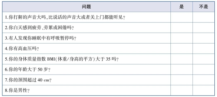 ①柏林问卷:该问卷包括3个类别。类别Ⅰ包含夜间打鼾和呼吸暂停共5个问题;类别Ⅱ有4个关于日间过度思睡的问题,其中1个是驾驶时思睡情况;类别Ⅲ有2个问题,包括是否患有高血压或身体质量指数(Body Mass Index,BMI)>30kg/m2。如果有2个以上类别为阳性,则认为该个体为OSA高风险。当使用AHI≥5次/h作为OSA诊断标准的截点时,柏林问卷灵敏度为76%,特异度为45%,诊断准确度为56%~70%,容易产生假阴性结果。此外,该筛查问卷条目较多,相对复杂,见表5.3。
