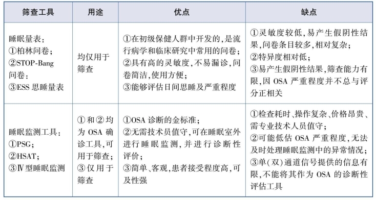 PSG是诊断OSA的金标准,但存在耗时费力、价格昂贵、专业技术要求高、等待检查时间长等问题。OSA高危人群的筛查更适宜采用简单易行、方便快捷、低成本的筛查手段。PSG多用于OSA筛查后确诊。对于筛查出的OSA高风险人群,若临床怀疑有其他睡眠障碍、神经肌肉疾病、充血性心力衰竭、呼吸系统疾病、阿片类药物使用、肥胖低通气综合征等严重伴发疾病时,首选PSG进行确诊。