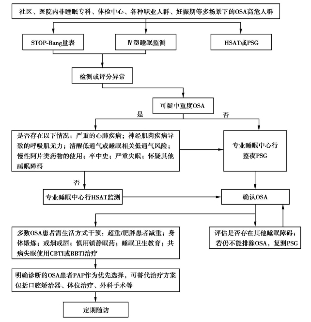 注:OSA为阻塞性睡眠呼吸暂停;HSAT为家庭睡眠呼吸暂停监测;PSG为多导睡眠图;CBTI为失眠认知行为治疗;BBTI为失眠简明行为治疗;PAP为气道正压通气