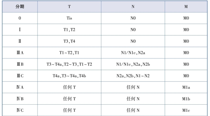 注:TNM分期前缀c为临床分期;p为病理分期;y为接受新辅助治疗后的肿瘤分期,如ypTNM为接受新辅助治疗后的病理分期;r为经治疗获得一段无瘤间期后出现复发。