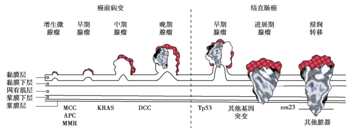 约70%的结直肠癌是由腺瘤性息肉演变而来,其演变过程可长达10~15年,是一个多步骤、多阶段、多基因参与的过程(图6.4)。
