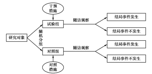 实验性研究(Experimental Study)又称实验流行病学(Experimental Epidemiology),是指根据研究目的,按照设计的研究方案,将来自同一总体的研究对象随机分配到试验组和对照组,对试验组人为地施加或减少某种处理因素,对照组实施对照措施,然后随访观察该处理因素的作用结果,比较两组间结局差异,从而判断处理因素的效果。分组过程中,尽可能遵守随机原则,以保证试验组除了干预措施(处理因素)以外的其他方面与对照组保持均衡可比,这样组间的效应差异可视为干预措施所引起的(图8.5)。