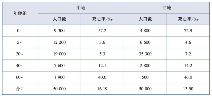【解】由表9.7可见,甲、乙两地总的死亡率比较,甲地(16.19‰)高于乙地(13.90‰)。但各年龄组死亡率显示,各年龄组的死亡率均为甲地低于乙地。不难发现,这两地人口总数虽同为50000人,但其内部的年龄结构却截然不同。甲地老年和儿童人口所占比例大,而乙地青壮年人口居多,这直接导致两地的粗死亡率不具备可比性。为消除内部构成的不同,需进行率的标准化。