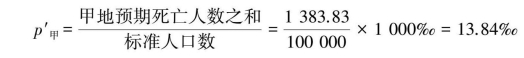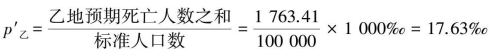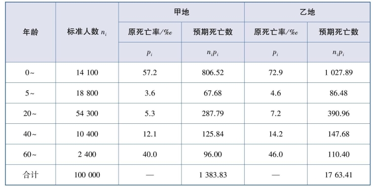 对于甲地,0~组原有的死亡率为57.2‰,将其应用于“标准人口”中,表示标准人口在原有死亡率下的预期死亡人数,n1p1=14100×57.2/1000=806.52。按此算法,将其余4组的预期死亡人数求出后,得到甲地预期死亡人数之和为∑nipi=806.52+67.68+…+96.00=1383.83(表9.8第4列)。类似地,对于乙地,其预期死亡人数之和为1763.41(表9.8第6列)。