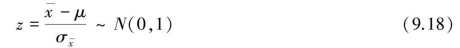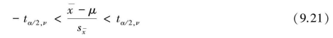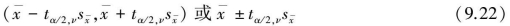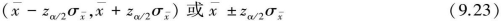 ②当σ未知但n足够大时(n≥30),可以认为t分布近似服从标准正态分布,即用zα/2代替公式(9.22)中的tα/2,ν,则总体均数μ的双侧(1-α)置信区间为