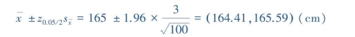 【例9.15】将例9.15中的样本例数增大到100,若其均数仍为165cm,标准差仍为3cm。试估计该地20岁女大学生平均身高的95%置信区间。
