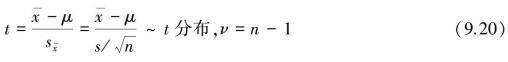 式中,统计量t也不再服从标准正态分布N(0,1)。英国统计学家W.S.Gosset于1908年以笔名“Student”发表论文,证明t值服从自由度ν=n-1的t分布。