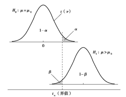 以t检验为例,说明假设检验的两类错误。当实际情况为H0成立时,由于抽样的偶然性,由样本数据计算得到的检验统计量t≥tα,P≤α,假设检验结论拒绝了原本成立的H0所犯的错误称为Ⅰ类错误或Ⅰ型错误(TypeⅠError),亦称假阳性错误。检验水准α即是预先规定的允许犯Ⅰ型错误的最大概率。