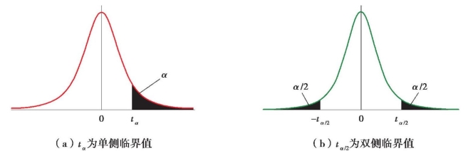具体地,在t界值表(附表2)中,横标目为自由度ν,纵标目为概率P,表中的数字表示当ν和P确定时,对应的t临界值(Critical Value)。该表分别给出了单侧概率(One-tailed Probability)和双侧概率(Two-tailed Probability)所对应的t临界值。在本书中,用tα,ν表示对应于单侧概率的t临界值,用tα/2,ν表示对应于双侧概率的t临界值,见图9.8。