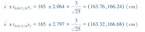 【例9.14】抽样调查某地20岁女大学生25人,获得身高均数为165cm,标准差为3cm。试估计该地20岁女大学生平均身高的95%和99%置信区间。