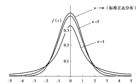 t分布,又称Student t分布(Student’s t Distribution),记作t~t(ν)。图9.7所示为t分布的图形。
