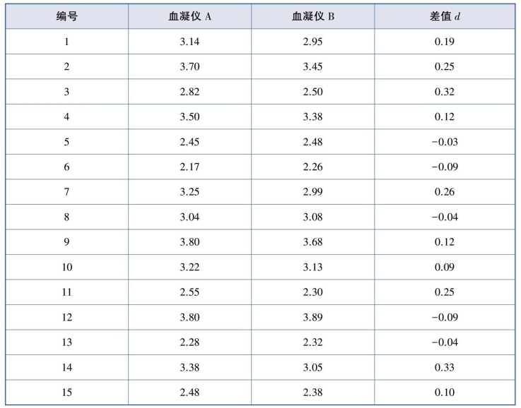 表9.10 两种血凝仪检测15名健康成年男子血浆纤维蛋白原(g/L)